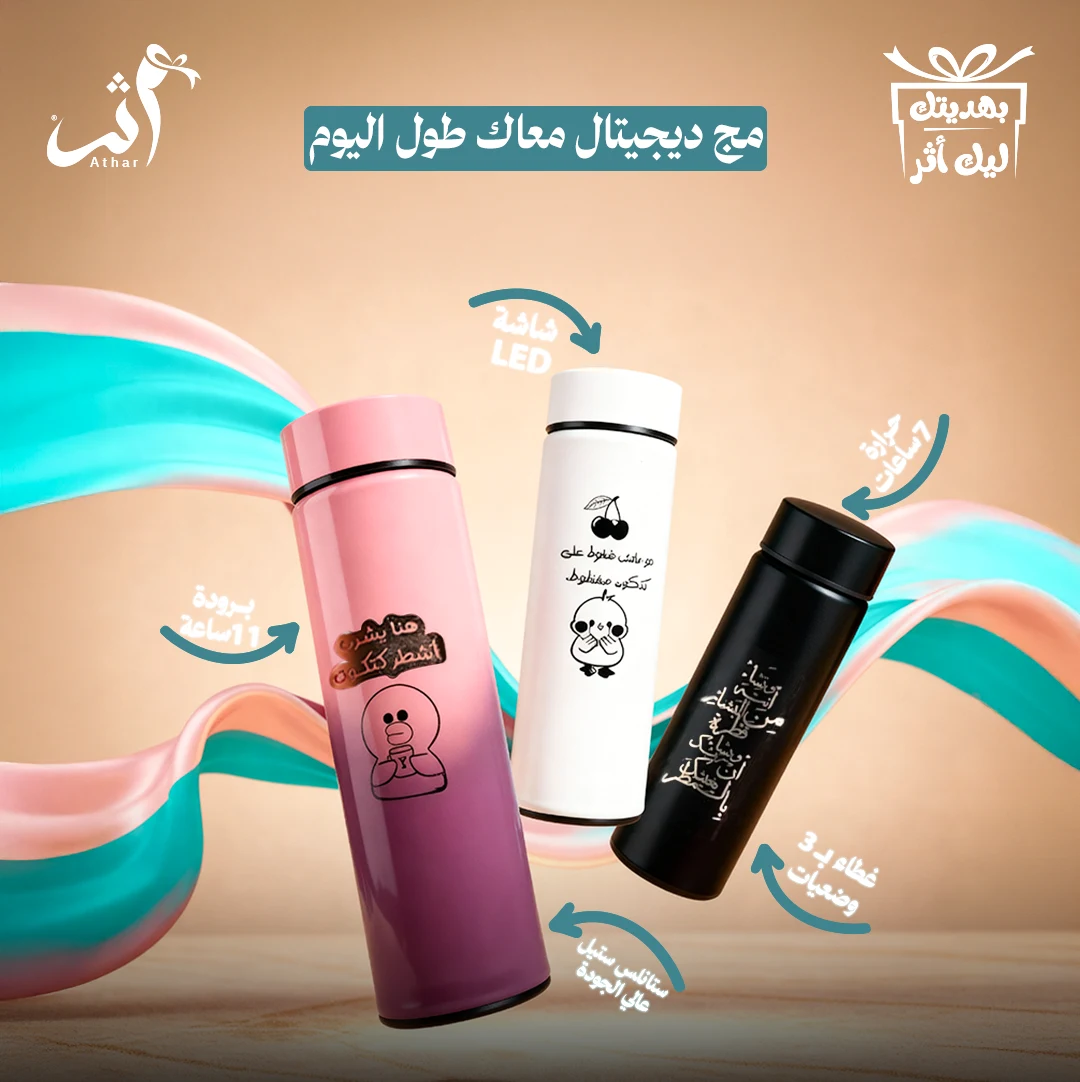 يمكنك الحصول على مج حراري ديجيتال من أثر، فقط تواصل معنا الآن وابدأ يومك بأناقة مع مج حراري ديجيتال من شركة اثر.